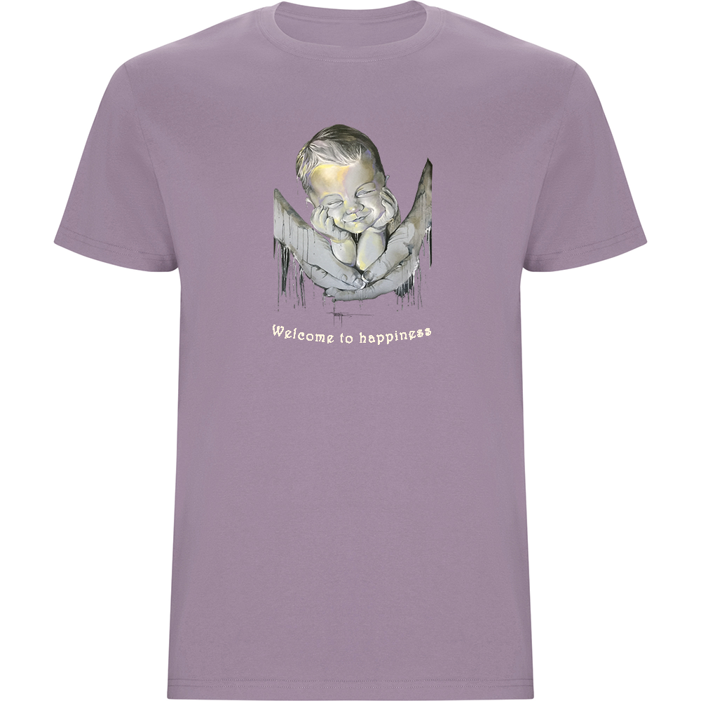 Obra «Bienvenido a la felicidad» de la artista Kelly Arrontes impresa en alta resolución sobre camiseta unisex 100% algodón de diferentes colores y tallas