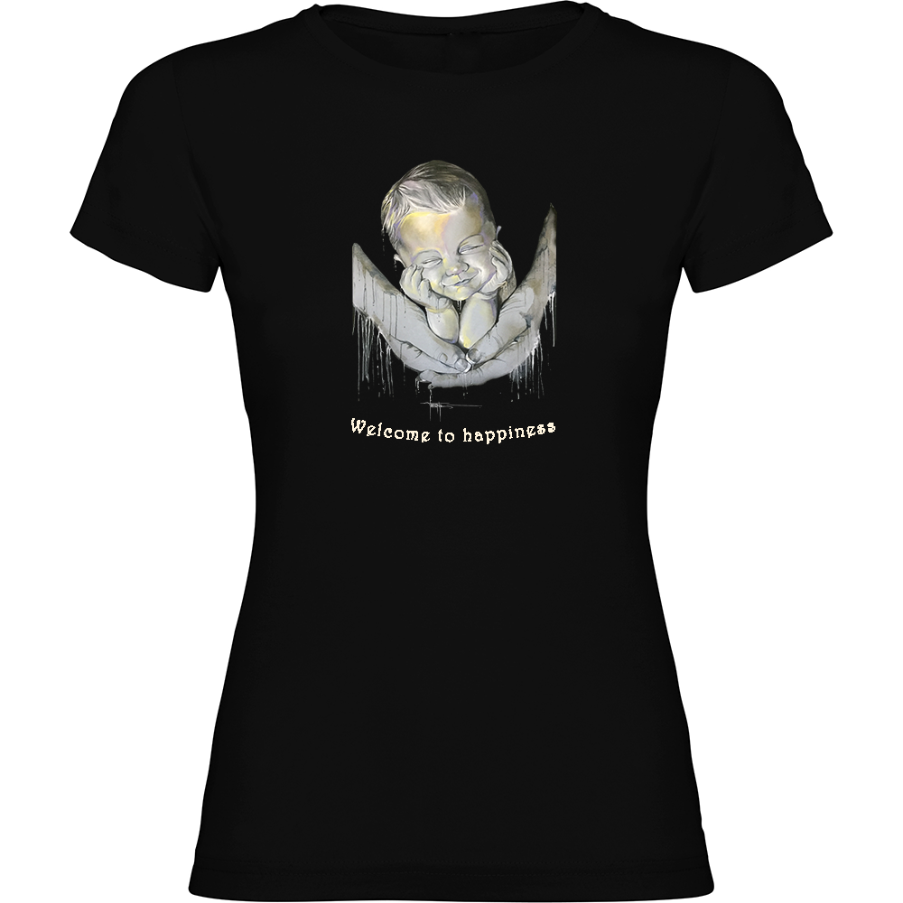 Obra «Bienvenida a la felicidad» de la artista Kelly Arrontes impresa en alta resolución sobre camiseta mujer 100% algodón de diferentes colores y tallas