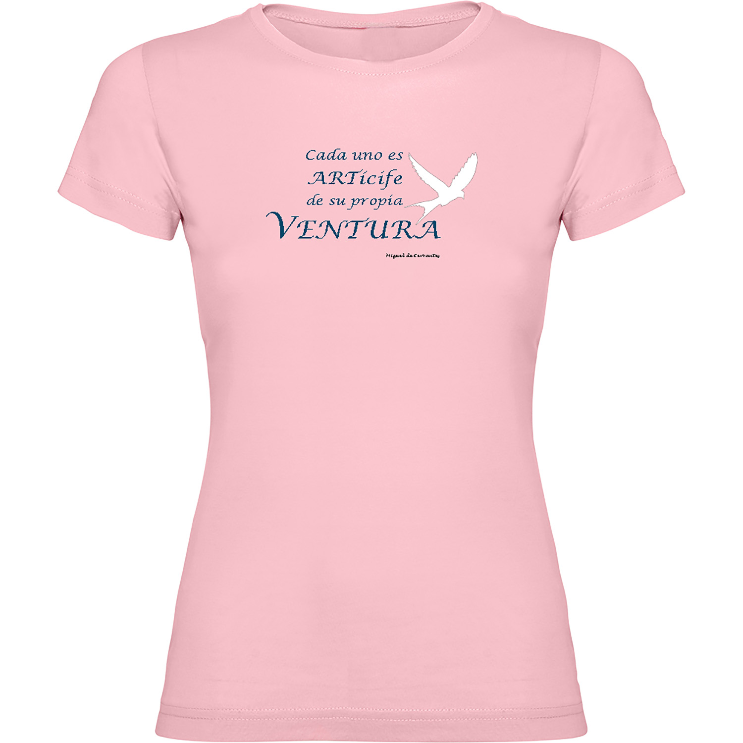 Cita célebre «Cada uno es artífice de su propia ventura» de Miguel de Cervantes impresa en alta resolución sobre camiseta mujer 100% algodón de diferentes colores y tallas