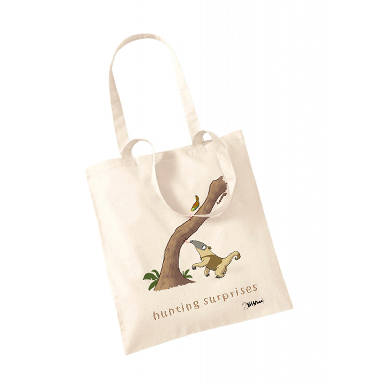 Obra «Cazando sorpresas» del artista Jone Areizaga impresa en alta resolución sobre bolsas 100% algodón. Capacidad 10 litros. Medidas 38 x 42 cm.