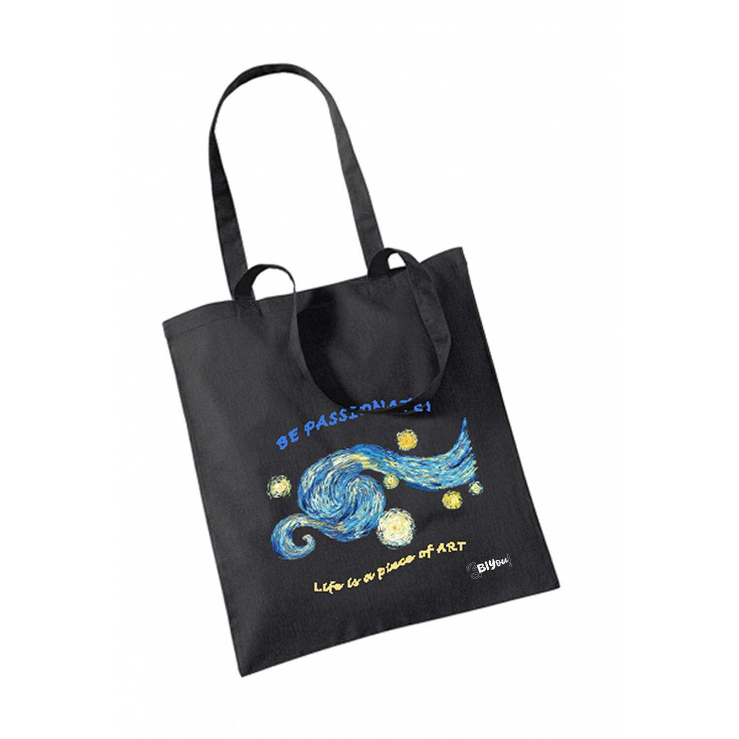 Ilustración «La vida es una obra de arte» basada en la obra “Noche estrellada” de Vincent van Gogh, impresa en alta resolución sobre bolsas 100% algodón. Capacidad 10 litros. Medidas 38 x 42 cm.