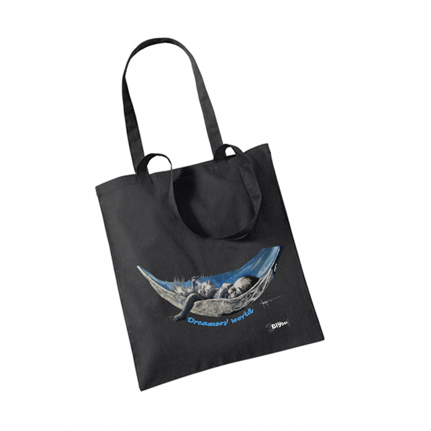 Obra «Mundo de soñadores» del artista Kelly Arrontes impresa en alta resolución sobre bolsas 100% algodón. Capacidad 10 litros. Medidas 38 x 42 cm.