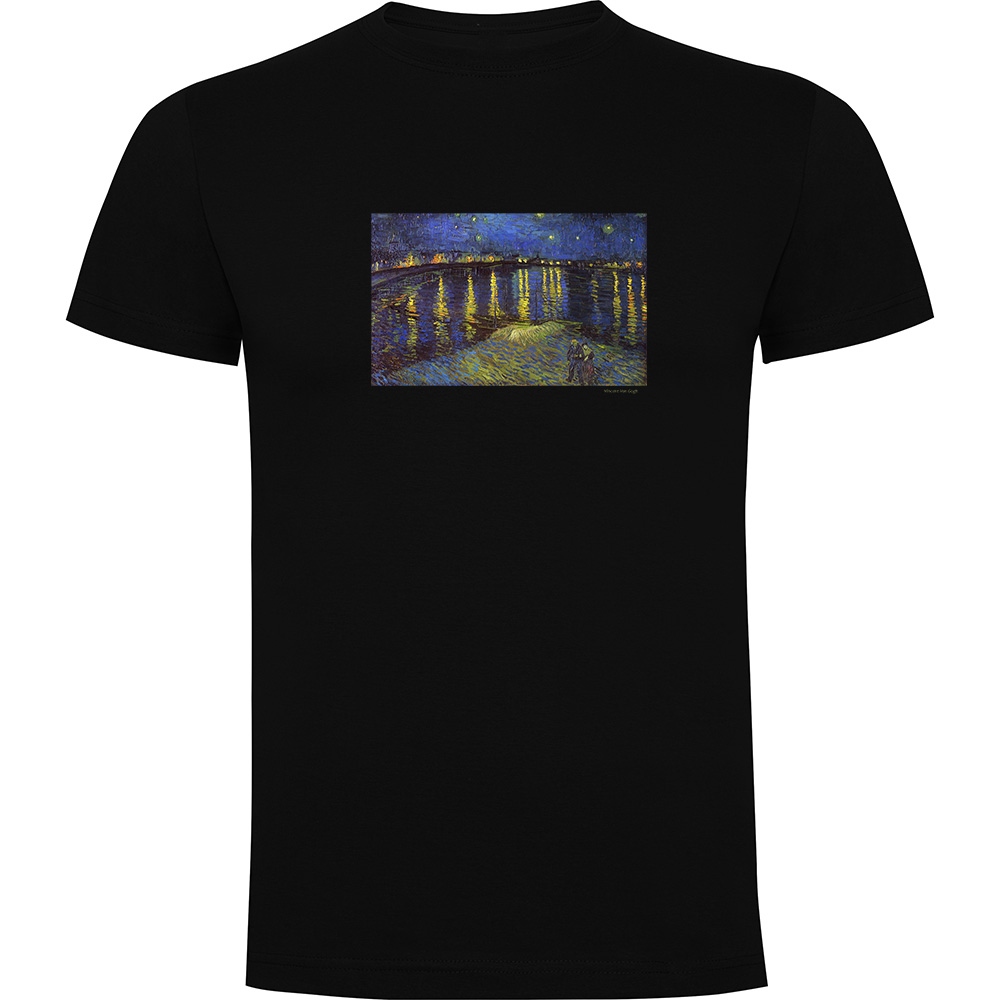 Ilustración «Noche estrellada sobre el río» de Vincent van Gogh impresa en alta resolución sobre camiseta unisex 100% algodón de diferentes colores y tallas